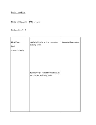 The product work log documents Mindy Akins' work on a scrapbook on March 13, 2013. On January 9th from 1-3pm, Mindy spent 2 hours at a nursing home where the residents played with baby dolls. Mindy provided commentary noting the regular activity of playing with dolls.