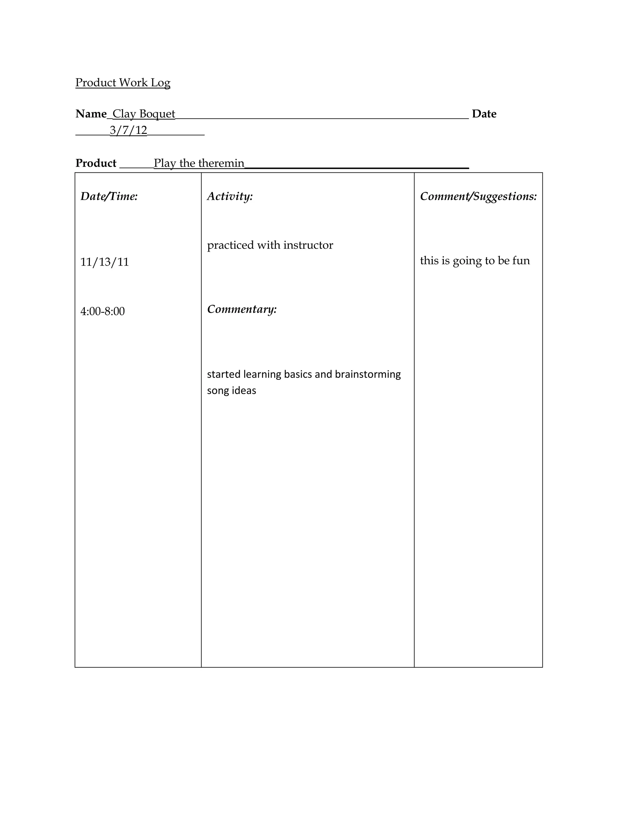 Clay Boquet's product work log documents his progress learning to play the theremin from November 13, 2011 to an unspecified date. He practiced with an instructor who found it fun and then spent 4-8 hours starting to learn basics and brainstorm potential song ideas to play.