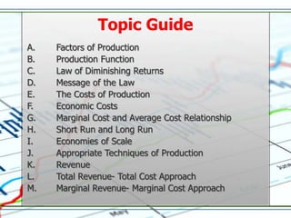 This document discusses key concepts related to production including factors of production, production functions, laws of diminishing returns, costs of production, and economies of scale. It defines factors of production as land, labor, capital, and entrepreneurship. Production functions explain how inputs like fixed and variable factors are transformed into outputs. The law of diminishing returns states that beyond a certain point, additional units of a variable input like labor will yield lower marginal products. Costs include total, fixed, variable, average, and marginal costs, and how they relate affects long and short run production. Economies of scale can come from external or internal factors that lower average costs for firms.