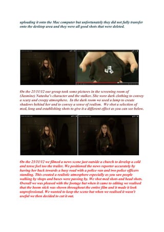 On November 9, 2012, the group filmed a news scene in a busy location to make it look realistic, taking different roles such as directing, filming, and setting up equipment. They shot from multiple angles to find the best background setting. The only issues were ambient noise and people talking in the background, which made the scene less effective.