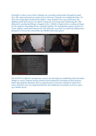 The document summarizes the filming process for a student film project over several dates in October 2012. It describes the scenes filmed, locations used, and characters portrayed. The filming involved setting up shots to build tension and mystery around the main character's discovery of a stolen diamond. The student filmmakers worked to improve their use of techniques like camerawork, lighting, and editing with each shoot.