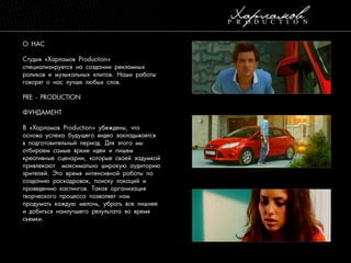 Студия «Харламов Production» специализируется на создании рекламных роликов и музыкальных клипов, с акцентом на креативную подготовку и высокий уровень технической реализации. Команда включает профессионалов, которые занимаются всем процессом от идеи до постпродакшна, используя современное оборудование и имея собственную актерскую базу. Студия также имеет партнерство с «R-Studio», предоставляющим все необходимые ресурсы для создания проектов любого масштаба.