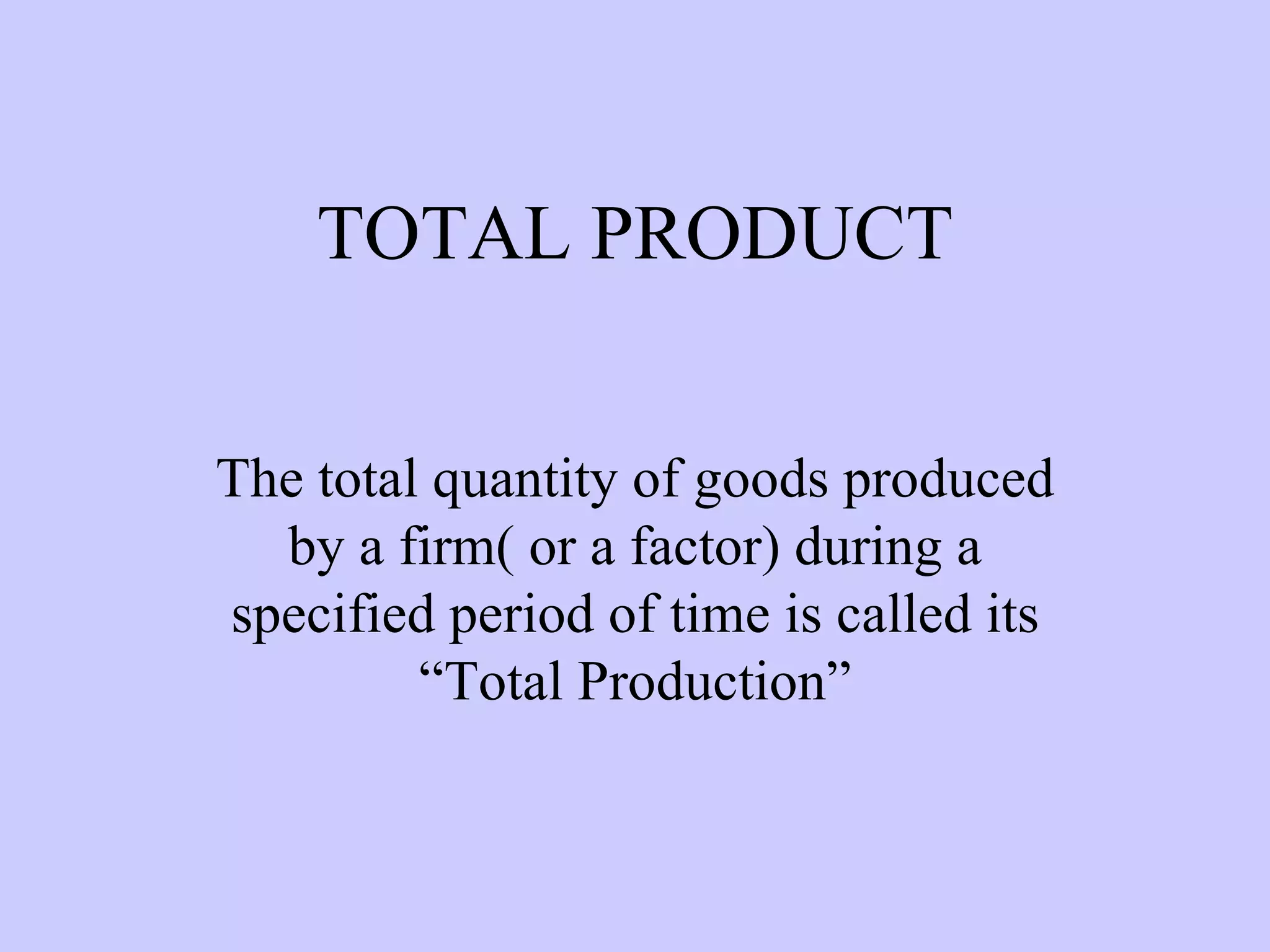 1. It defines total production, marginal product, and average product, and explains the law of variable proportions.