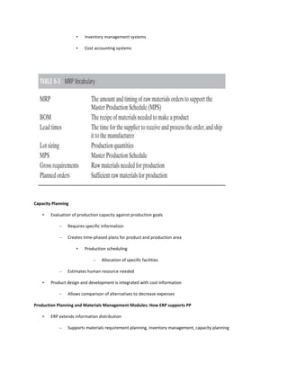 The document discusses production and materials management. It describes the objectives of production systems which include creating production plans, acquiring raw materials, scheduling resources, designing products, and producing items to quality standards. It also outlines the operational processes like purchasing, receiving, quality control, and inventory management. The document notes that production planning and manufacturing processes are supported by information systems like data collection, materials management, bill of materials, inventory management, and cost accounting systems. It also covers capacity planning, production planning and materials management modules in ERP systems, and materials management modules.