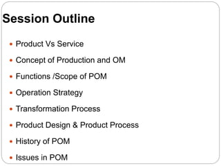 The document provides an overview of production and operations management (POM), detailing its functions, significance, historical contributions, and transformation processes involved in the production of goods and services. It outlines the importance of operations management in optimizing resource use, ensuring quality, and enhancing customer satisfaction, while also describing various manufacturing processes and operational strategies. Additionally, it emphasizes the need for effective planning, organizing, controlling, and understanding employee behavior to achieve operational efficiency.