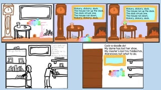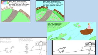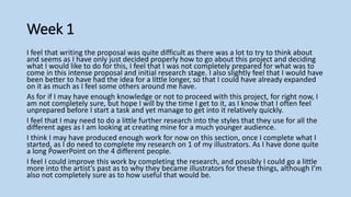 The document is a production diary for a children's book project. Over several weeks, the diary details the planning and research process. In week 1, the author struggled with the proposal but hoped to learn more over time. Research in weeks 2-3 taught the author about children's book styles and presentations. In week 4, the author identified potential problems like computer issues and looked at printing options. Week 5 involved further problem-solving. Week 6 was spent planning nursery rhymes and pages. By week 7, planning was largely complete ahead of production starting in week 8. The diary shows the progression from early challenges to feeling prepared for the production phase.