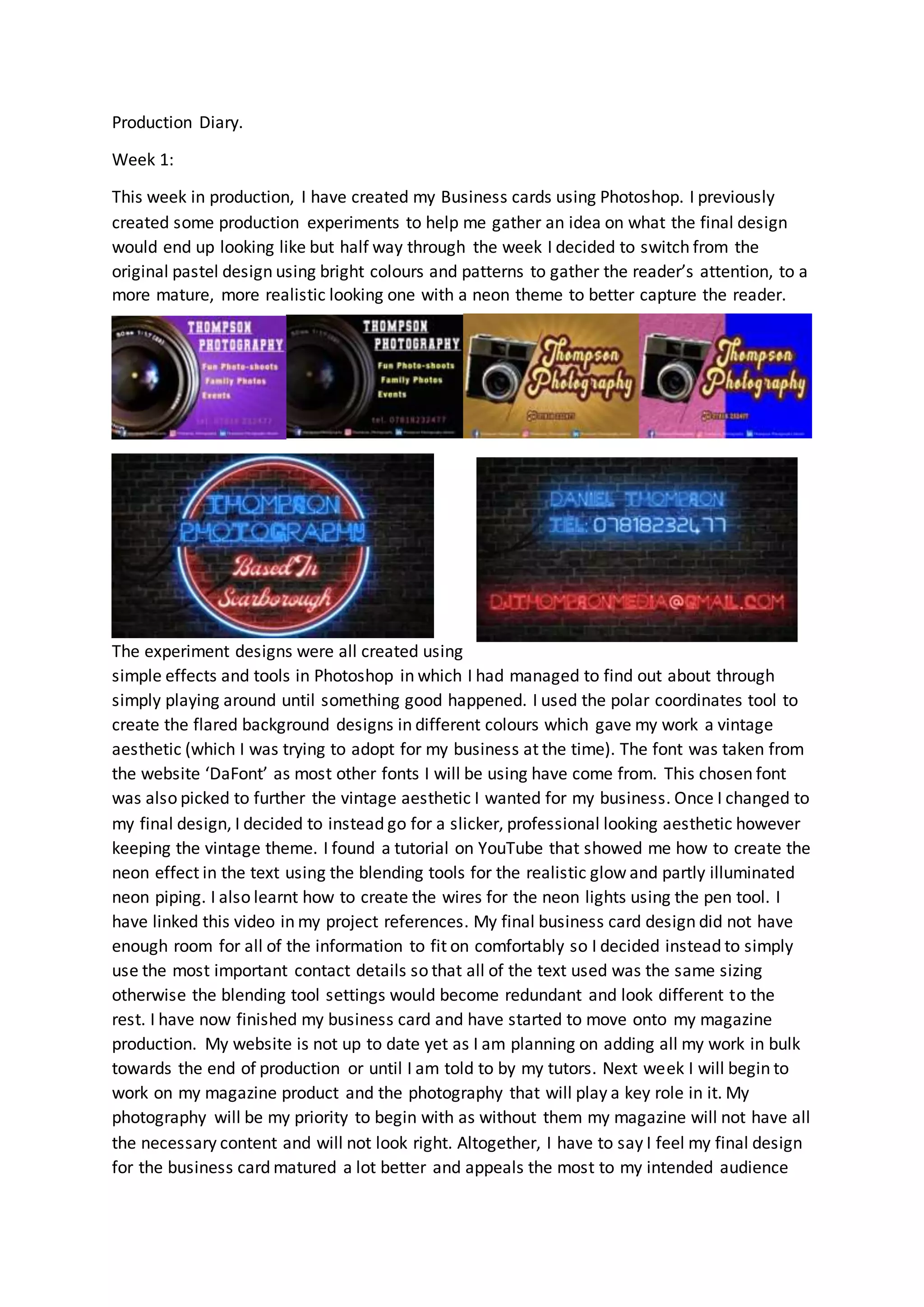Week 1: The producer created business cards in Photoshop using a neon theme. They experimented with different designs before settling on a professional look. They learned Photoshop techniques like the polar coordinates tool.