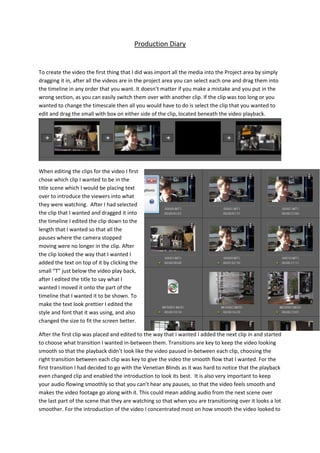 1) The document describes the process of editing a video production diary. Key steps included importing media, arranging clips on the timeline, editing clip lengths, and adding titles.