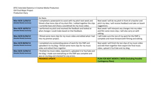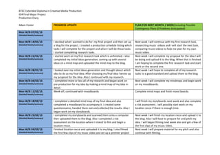 This document contains the production diary and progress updates of a student named Adam Foster for their BTEC Extended Diploma in Creative Media Production final major project over 14 weeks. It details the tasks completed each week such as research, pre-production including mind maps, storyboards, and test filming. The student provides plans for the following week which generally include completing the current work and beginning new tasks such as additional filming, editing, and final project completion and submission.