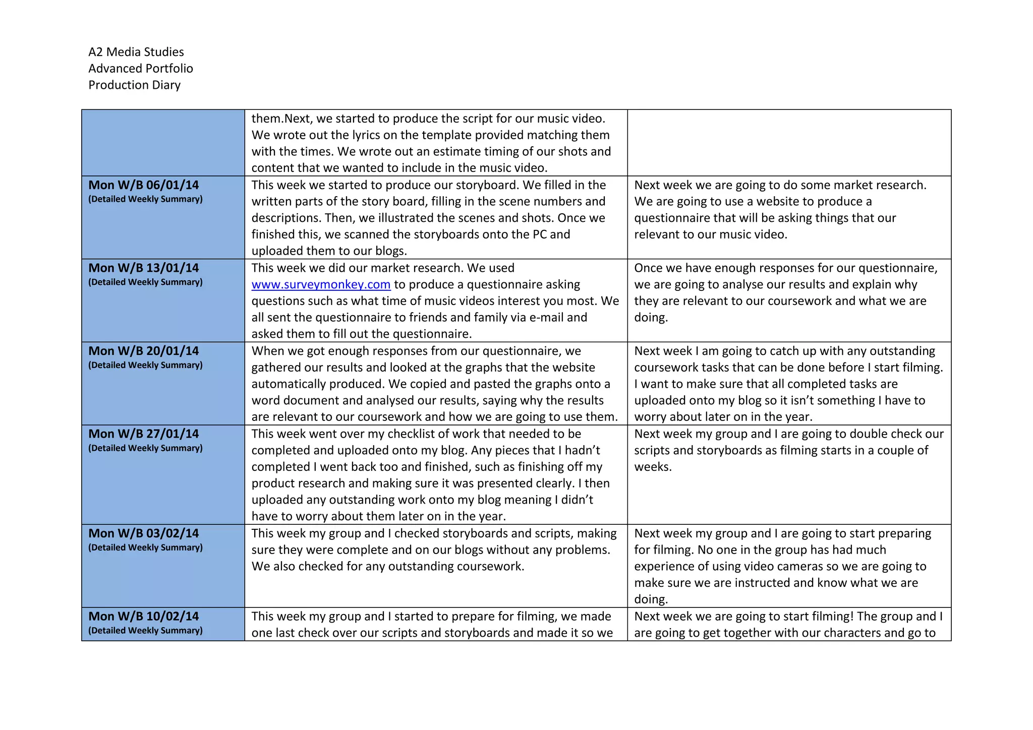 This document is a production diary for an A2 Media Studies course. It provides monthly and weekly summaries of the progress made on a group music video project over the course of a year. The summaries describe research, planning, filming, editing, and evaluation activities. Contingency plans are included in case of delays or issues. The final summary indicates all work has been completed and uploaded ahead of the deadline.