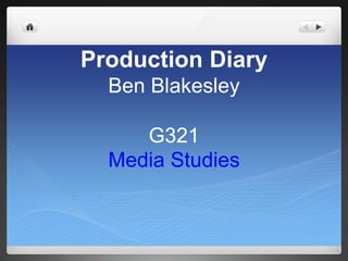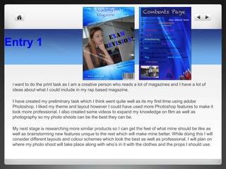 Ben Blakesley has created a production diary documenting the process of creating a rap-based magazine. Over the course of 16 entries, Ben details researching similar magazines, conducting photo shoots, designing pages like the front cover and contents page, editing photos, and refining details. The final entries discuss completing tasks like proofreading text and evaluating the magazine through different media formats.