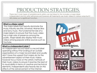 This document provides information on music video production and distribution through major labels, independent labels, and self-produced artists. It discusses the roles and characteristics of major labels like Universal, Sony, and Warner Bros in promoting music videos through high budgets and mainstream artists. Independent labels focus more on artistic vision over promotion and rely on new technologies and the internet. Major labels have large corporate structures and subsidiaries while independent labels range in size. New technologies like social media have benefited independent labels for promotion. The document also discusses expensive music videos and directors like Hype Williams, and concludes that a major label would be best for mainstream exposure.