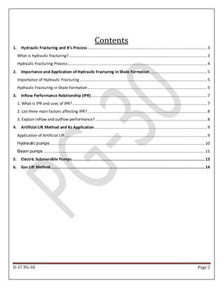 The document is a practical manual for production engineering focusing on hydraulic fracturing, its process, and applications in shale formations. It covers the importance of hydraulic fracturing in increasing oil and gas recovery, details the inflow performance relationship, and explores artificial lift methods used to enhance production. Additionally, it discusses various techniques and technologies used in hydraulic fracturing, including equipment, methods of fluid injection, and the dynamics of fracture formation.