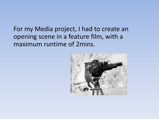 The document evaluates a media project involving the creation of a 2-minute opening scene for a thriller film, exploring how it utilizes and challenges genre conventions. It discusses the representation of social groups, distribution possibilities, target audience demographics, and the use of technology in production. The author reflects on the learning process from the initial task to the final product, emphasizing teamwork challenges and the importance of editing and cinematography.