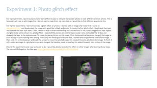 1. A glitch effect was created on a black and white model photo by desaturating, duplicating layers, adjusting RGB, and moving selected areas to produce glitches.