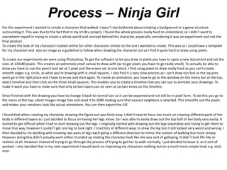 The document describes two experiments conducted by Sumiah Rose to practice pixel animation. In the first experiment, she created a ninja girl character but struggled to animate the legs walking realistically. In the second experiment, she focused on animating a stick figure walking by copying a step-by-step template, though the animation was still imperfect. She reflected that stripping animation down to basics helped her focus on the walking motion, and adding a simple moving background was a good first step towards more complex animations for her video game project.