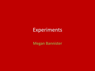 Megan Bannister conducted two experiments for a game design project. Experiment 1 involved creating pixel art characters of different sizes to populate the game world. She found that more detailed 64x64 pixel characters were better than the simpler 32x32 pixel ones. Experiment 2 was creating a running animation cycle to practice character animation. Megan animated both stick figure and full character versions and reflected that including basic walk cycles in the final game could add atmosphere versus more energetic running. Both experiments provided lessons on character and environment design that Megan plans to apply to the final project.