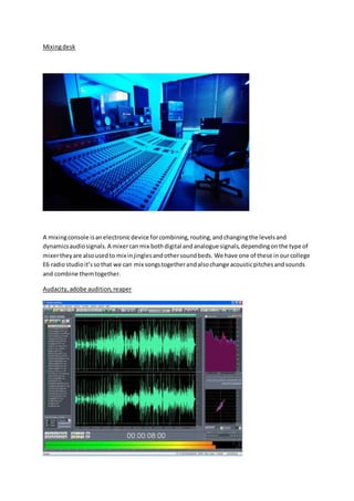 The document discusses the equipment needed to produce radio advertisements, including a mixing desk to mix music and alter pitch, a soundproof recording booth to record high quality audio without outside noise, and audio editing software to modify sounds. It notes that renting a soundproof recording studio costs around £900 per hour on average. The document also describes the radio station at the author's college, E6 Radio, which has its own music library and equipment like a mixing desk for combining songs and altering sounds. It compares different audio editing software programs, noting that while Adobe Audition is professionally used, the free and open-source Reaper has sufficient features for students' college radio work.