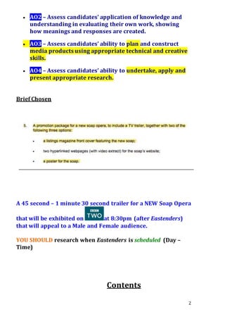 The document provides information about a media studies student's production log for a trailer for a new soap opera. It includes details about the student's aims, objectives and research conducted. Research included analyzing codes and conventions of existing soaps like EastEnders and Coronation Street. The student also researched the purpose of trailers and roles of producers and directors. Their soap opera trailer will air after EastEnders on BBC Two.