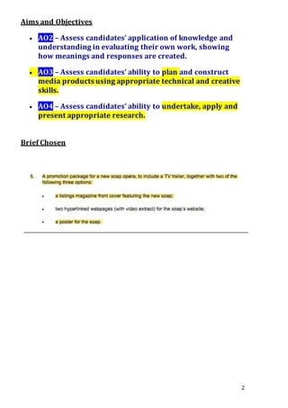 This document contains an analysis of codes and conventions in soap opera trailers and genres. It examines trailers for the soap operas EastEnders and Hollyoaks, identifying codes like multi-stranded narratives, romance, family conflict, and focus on working-class communities. It discusses how these codes appeal to and impact audiences. The document also provides a definition of a multi-stranded narrative and analyzes a 10-minute clip of EastEnders for codes and their audience impact.