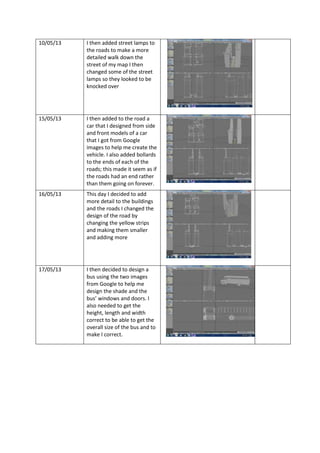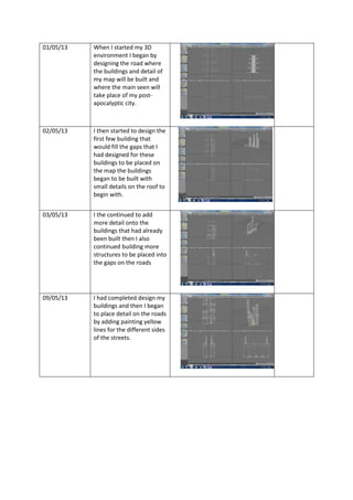 The document describes the process of designing a 3D post-apocalyptic city environment over multiple dates. It begins with designing the roads and first buildings, then adds more buildings and details like street lamps, painted road lines, and vehicles obtained from online images. Interior details like rooms, doors and windows are later added to buildings. Color is eventually applied to objects to aid texturing for a fly-through video of the virtual environment.