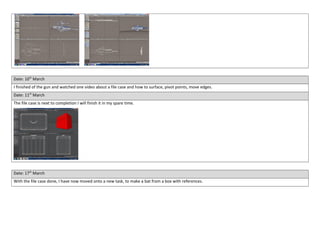 Kyle created several 3D models for a games design course using Lightwave software. He started by making a hammer through extrusion tutorials. Next, he modeled a gun similarly to techniques in Illustrator. Later projects included a file case and bat modeled from boxes. Kyle also began his own robot design, researching sidekicks and sketching ideas. Through mirroring and coloring, he finished a complete bat model over multiple dates in March.