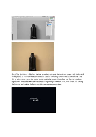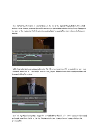 The document summarizes the steps taken to produce an advertisement for a bottle of aftershave. These steps included creating still images to showcase the bottle and logo, editing video clips by adjusting sizes and adding slow motion, placing transitions between similar shots, importing and editing music by adding fades and fixing issues with added silence.