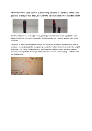 This document summarizes the process of creating a short advertisement video. It was filmed in a friend's empty room using a clear plastic sheet taped to the wall to simulate painting a sun. Close-up shots were primarily used to focus on lip movements. The filmmaker shot various clips themselves, including applying a product, balloons, product packaging, and painting on the sheet. All clips were edited together in Adobe Premier along with the song "Mr. Brightside" by The Killers. The final video was exported and uploaded to YouTube.