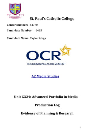 This document contains planning and research materials for a media studies student's advanced portfolio project on producing a trailer for a new soap opera. It includes the student's aims and objectives, research on soap opera codes and conventions using examples from EastEnders and Coronation Street, and planning for production roles and deadlines. Research was also conducted on the target channel, BBC Two, including its audience figures and programming. The materials provide background and reference information to help the student conceptualize and create their trailer assignment.