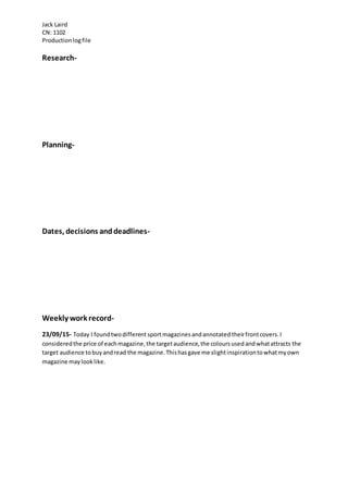 Jack Laird created a production log file to track his weekly work. On September 23rd, he analyzed two sports magazines by considering their price, target audience, colors used, and what attracts customers. Analyzing the magazines provided slight inspiration for what his own magazine may look like.