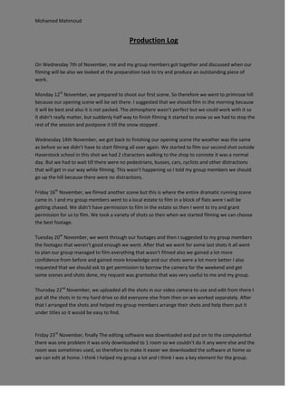 Mohamed and his group discussed their film production plans and prepared to shoot their first scene at Primrose Hill on November 12th. However, filming was cut short due to snow. They continued filming additional scenes on November 14th and 16th, including a dramatic running scene at a local estate without permission. Throughout the process, Mohamed helped arrange shots, edit footage, and secure additional time with equipment to complete the project.