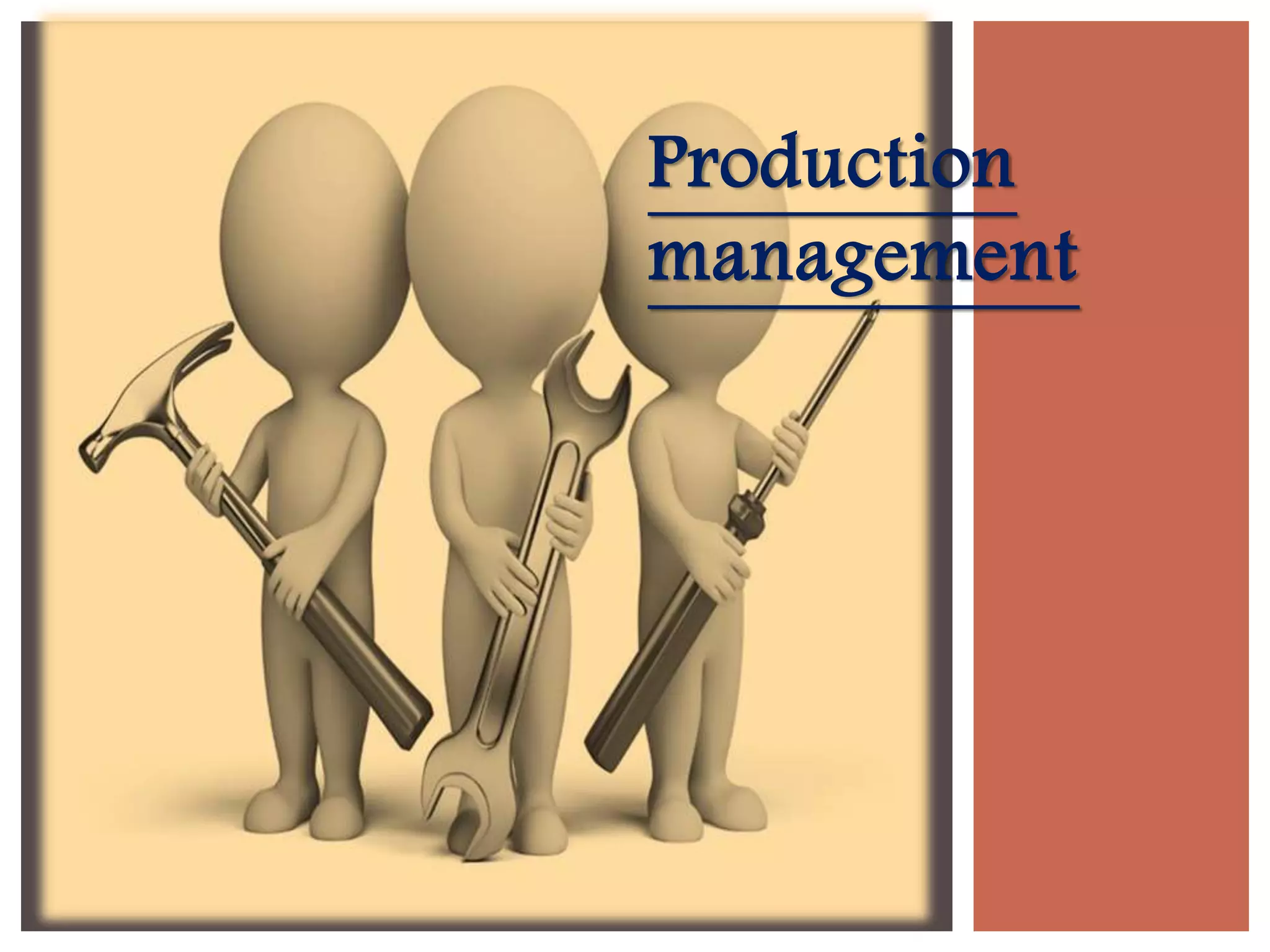 The document discusses various aspects of production management including definitions, objectives, and key functions. Production management aims to produce quality products according to specifications, on schedule, and at minimum cost. It involves planning and regulating the transformation of raw materials into finished goods. Key aspects of production management include material management, cost control, and operational management. Material management involves inventory control and purchase functions. Cost control focuses on labor and material costs. Effective production management is essential for business success.