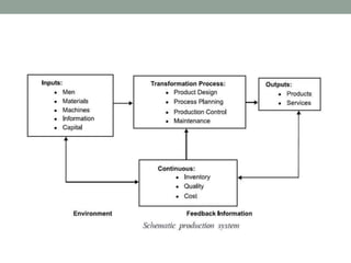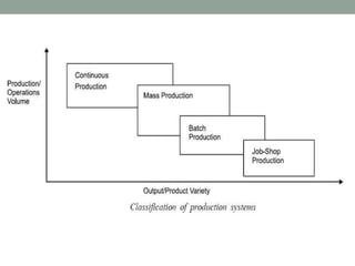 This document provides an overview of production management. It discusses key concepts like the definition of production, different production systems (job shop, batch, mass, continuous), objectives of production management, and the role of technology and innovation in production. The main types of production systems are described in terms of their characteristics, advantages, and limitations. The document emphasizes that the goal of production management is to produce quality goods and services at the right time, quantity, and cost.