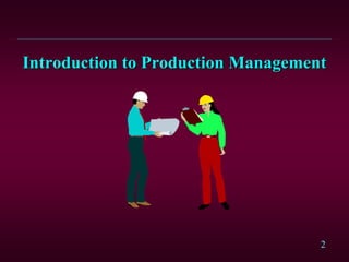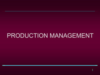 This document provides an overview of production management. It discusses the historical milestones in operations management such as the Industrial Revolution, scientific management, and the computer revolution. It also covers the different ways of studying operations management, including viewing production as a system and the three types of decisions: strategic, operating, and control. The goal of operations management is to efficiently manage an organization's resources and production process.