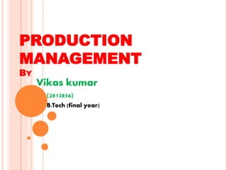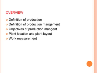 This document provides an overview of production management. It defines production as the transformation of inputs into outputs. Production management deals with decision making related to production to ensure goods are produced according to specifications, in the required amount and on schedule at minimum cost. The objectives of production management include producing quality products at minimum cost and the right quantity at the right time. Other topics discussed include plant location, layout, work measurement, and production control elements like planning, routing, scheduling, and inspection.