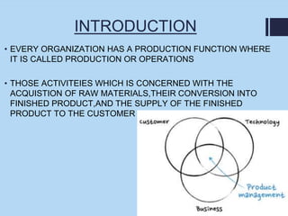 The document discusses the concept of production management within organizations, highlighting its role in the transformation of raw materials into finished products. It emphasizes the importance of effective planning, decision-making, and supervision to meet quality, cost, and scheduling objectives. Additionally, it outlines various types of production, including job, batch, and mass production.