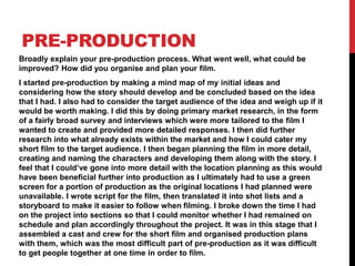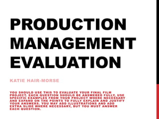 Katie evaluated her final film project using a provided rubric. She felt her pre-production went well though location planning could have been improved. Production went smoothly despite issues with lighting and sound. Post-production challenges included special effects and sound editing. Scheduling her cast and crew was difficult. Lack of contingency for her actor canceling last scenes hurt the film. She learned new skills but pushing visual effects too far compromised quality. Feedback helped improve her film and understanding. While technical quality suffered, the film met her creative vision and deadline.