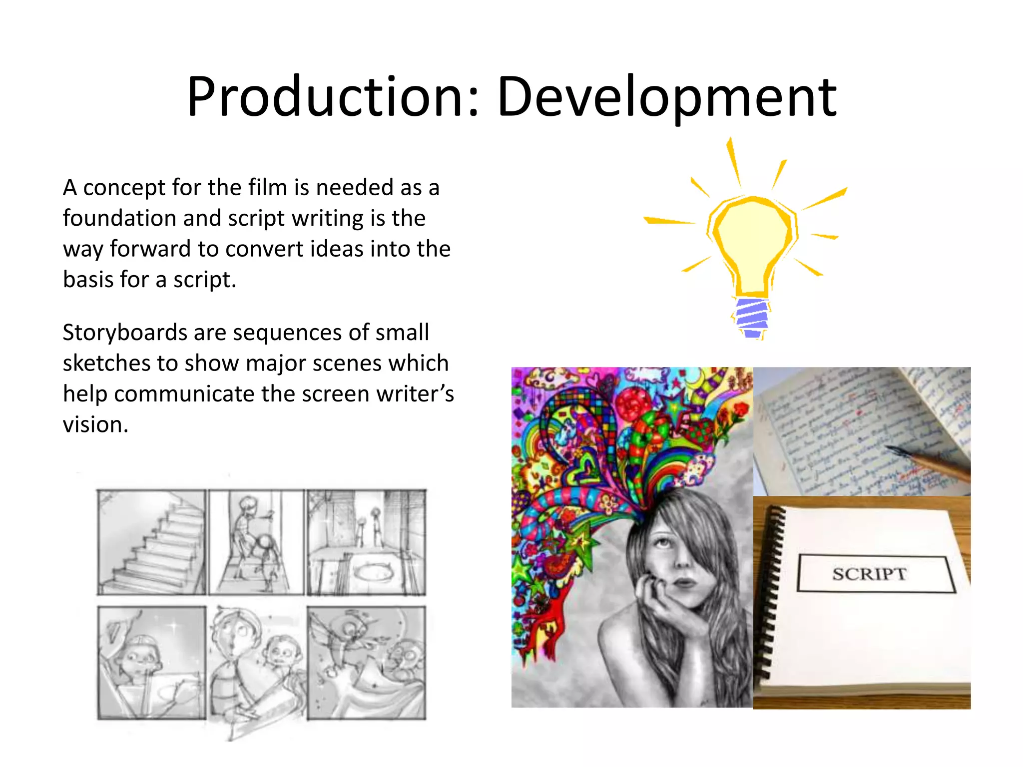 The document discusses various aspects of film production including development, budget, cast and crew, location, equipment, distribution, marketing, and exhibition. It notes that a script is needed to develop an idea into a film and storyboards help communicate the vision. Budgets must account for costs and potential success. Cast is important while crew contribute specialized skills. Location and equipment needs vary depending on the film's scale and vision. Distribution involves festivals, cinemas, videos, and online platforms. Marketing uses trailers, posters, and online advertising. Films can now be easily viewed through cinemas, DVDs, video on demand, and online platforms.