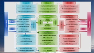The production module of ERP systems is designed to facilitate production planning, taking orders, and delivering products to customers. It allows for process definition, bill of material creation, material requirements planning based on machine capacity, production planning to optimize resource utilization, and automatic generation of job orders and daily production plans. Key features include production scheduling, reserving materials for production, and options to change production plans.