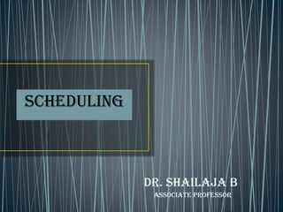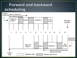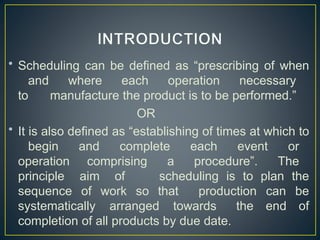 Scheduling involves planning the timing of operations in production to ensure completion by due dates, focusing on principles like optimum task size and production plan. Two primary methods are forward scheduling, which schedules jobs based on earliest availability, and backward scheduling, where jobs are timed to meet specific delivery dates. Various tools such as Gantt charts and mathematical programming methods are used to optimize the scheduling process across different types of industries.