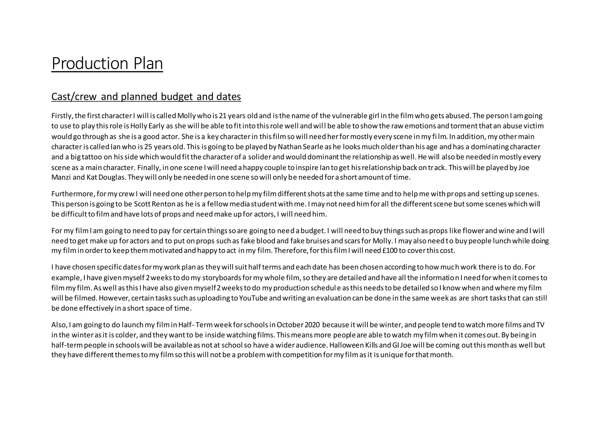 The production plan outlines the cast, crew, budget, and schedule for the film. The main characters Molly and Ian will be played by Holly Early and Nathan Searle respectively and will be in most scenes. A couple played by Joe Manzi and Kat Douglas will be in one scene. Scott Renton will assist as crew. The £100 budget will cover props, makeup, and meals. Specific dates are allocated for storyboards, production schedule, uploading, and evaluation to suit the production needs. The film will launch in October 2020 to target winter audiences.