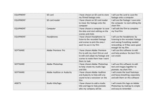 This document outlines a production plan for a short film. It details the equipment, software, assets, cast and crew, budget, timeline, and legal considerations for the film. The film will be a thriller about a girl who gets captured. A Canon camera, tripod, SD cards, computer, headphones, and Adobe software will be used to film, record, and edit the shots. Sound effects and a studio logo will also be created. The film is planned for a March 22nd release date and will be submitted to online film platforms. Legal permission is not needed from actors but may be needed for some purchased assets.