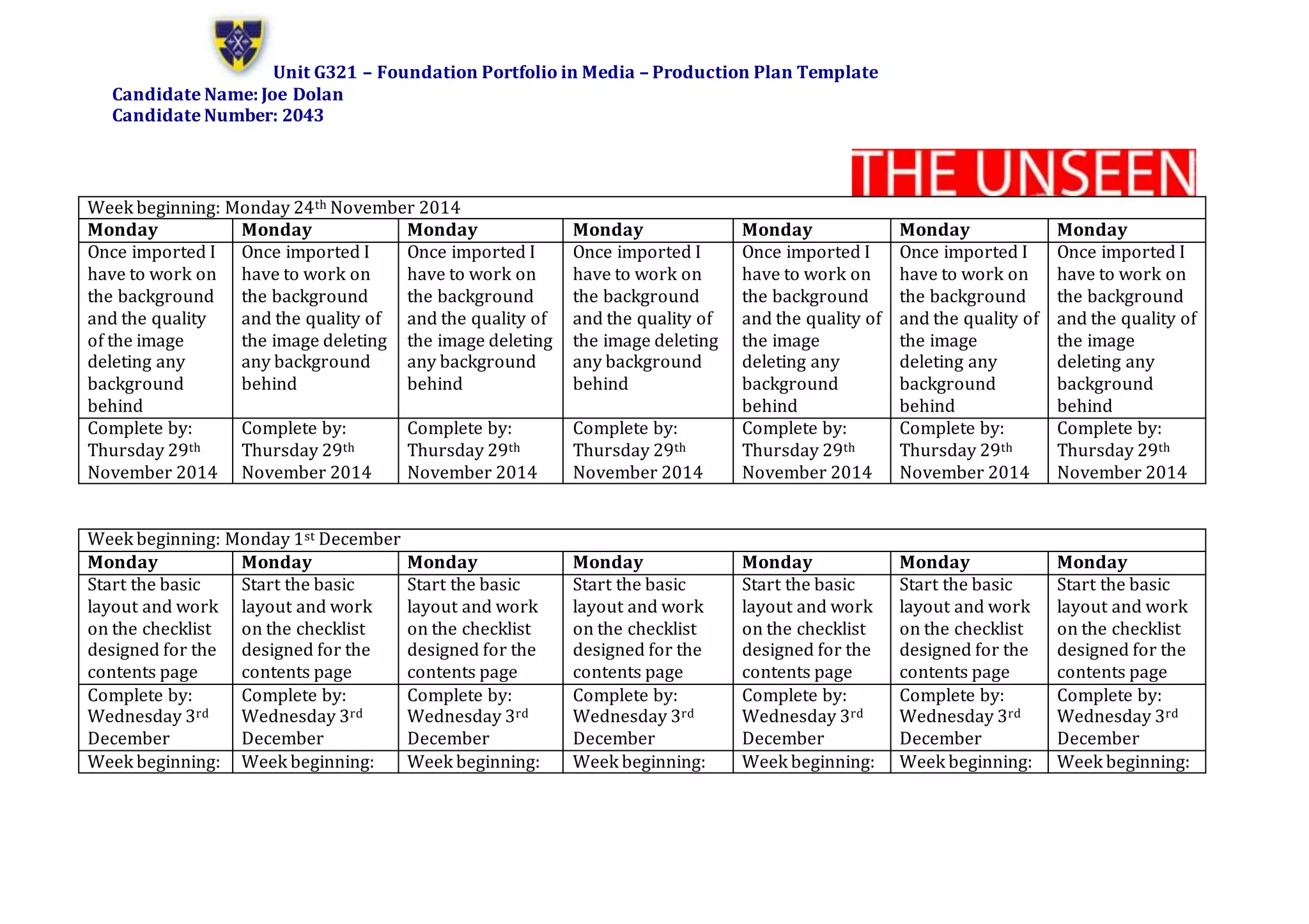 This document contains Joe Dolan's production plan for a media portfolio project. It details his planned activities and tasks for each week from November 2014 through January 2015. The plan involves importing images and editing them, designing layouts for a contents page and editorial page, starting a double page spread, and completing a question and answer section. All tasks are assigned completion dates to structure Joe's work over the scheduled period.