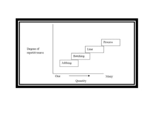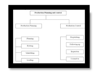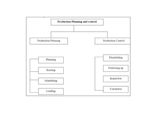 The document discusses production planning and control functions including process planning, loading, scheduling, dispatching, and follow up. It explains that process planning determines the sequence of operations, loading assigns work to work centers based on schedules, and scheduling determines start and finish times of operations. Dispatching authorizes the start of operations and follow up monitors progress. The document also covers factors that affect production planning like type of product and manufacturing. Different planning functions are needed for job shops, batch production, and mass production. Finally, it discusses scheduling objectives like meeting due dates and maximizing resource utilization.