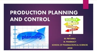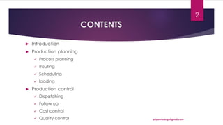 The document discusses production planning and control in manufacturing, highlighting the importance of coordinating men, materials, and machines to optimize efficiency and minimize costs. It outlines the processes of production planning, including process planning, routing, scheduling, loading, and control measures like dispatching, cost control, and quality control. The document emphasizes the need for detailed planning to ensure timely delivery and adherence to quality standards.