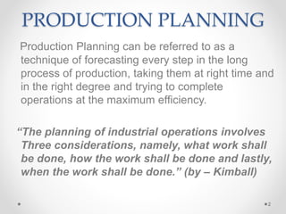 Production planning and control (PPC) involves planning production activities, routing work, scheduling operations, loading work assignments, and following up to ensure work is progressing as planned. PPC has evolved since the late 19th century as factories grew in size and complexity. The Toyota Production System is renowned for its use of PPC principles like just-in-time production and continuous improvement. PPC allows for optimized resource use, cost control, and coordinated plant activities when implemented effectively.