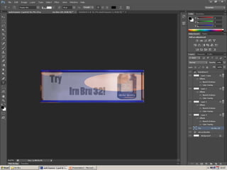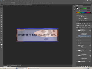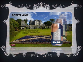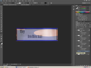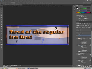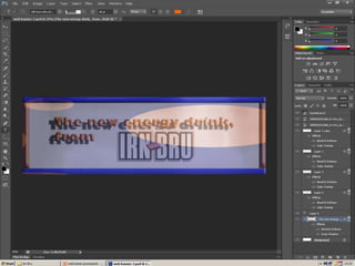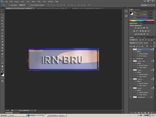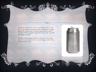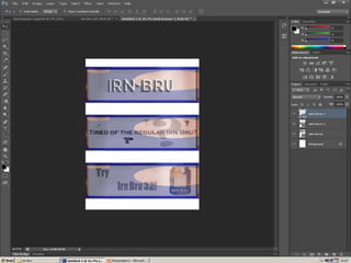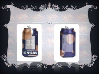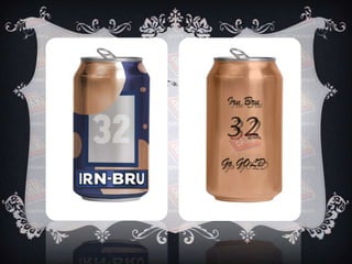 This document discusses the process of designing an Irn Bru can. The designer began by finding an image of a can to use as a base. They edited the can in Photoshop, changing the color and adding text. They tried different font styles and layouts. A clear window was added to make the can unique. The designer enlarged the window and tried different fonts for the text. Images from actual Irn Bru cans were added. Nutritional information, a logo, and barcode were also included. In the end, the colors were adjusted to improve the final design.