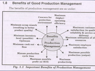 1) The conversion of raw materials into finished goods using processes, machines, tools and workers is known as production. Production management deals with efficient production planning and control.