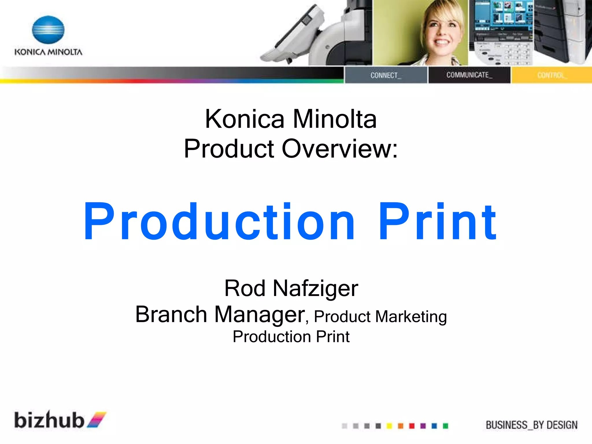 The document provides an overview of production print products from Konica Minolta and Kodak, including specifications and features. Konica Minolta offers various digital presses and monochrome printers ranging from 55 to 120 pages per minute, using technologies like Simitri toner and image processing. They have paper capacities up to 14,000 sheets and finishing options including stapling, binding and folding. Kodak's Digimaster series includes monochrome systems from 110 to 300 pages per minute, with inputs, processing, printing and sophisticated finishing capabilities.