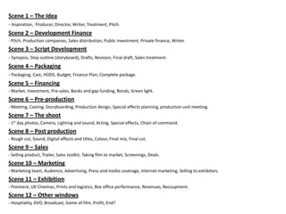 The document outlines the typical 12-step production process for films, from initial idea development through marketing and distribution. Key stages include developing financing, scriptwriting, pre-production planning, principal photography, post-production editing, marketing the film for sales and exhibition in cinemas and other distribution windows. Examples are provided for two films, Avatar and Paul, illustrating how they progressed through these standard stages in developing the idea, financing, production, post-production, marketing and release.